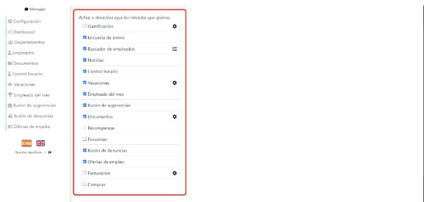 Como puedes ver, algunas opciones (Gamificación, Vacaciones, Documentos y Facturación) tienen un botón complementario con forma de engranaje que te permite configurar algunos aspectos complementarios de cada función. Para información complementaria, acceder a la documentación específica de la función que quieras saber más.